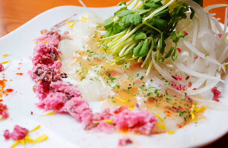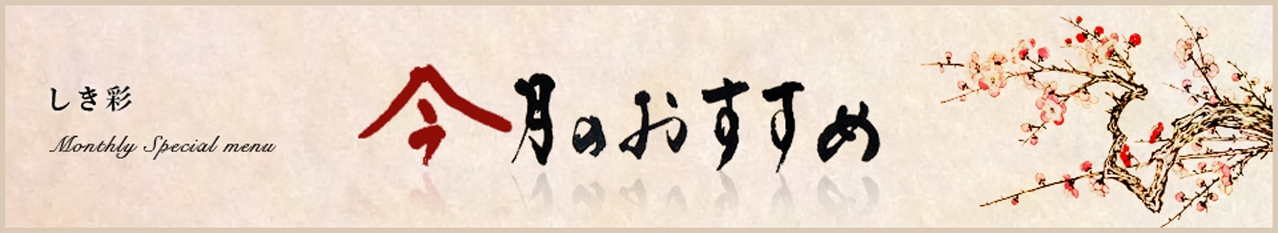 「しき彩」では、有名旅館などで腕を磨いた経験豊富なスタッフが在籍し、地元、豊岡・但馬の旬の食材を使ったこだわりの創作料理をご提供しています。 人気の創作お料理をはじめ、毎月、その季節ごとに、その時一番旬なお魚やお野菜を仕入れ、季節問わず、お客様にお楽しみ頂けるお料理をお出しする月替わりの創作料理もございます。